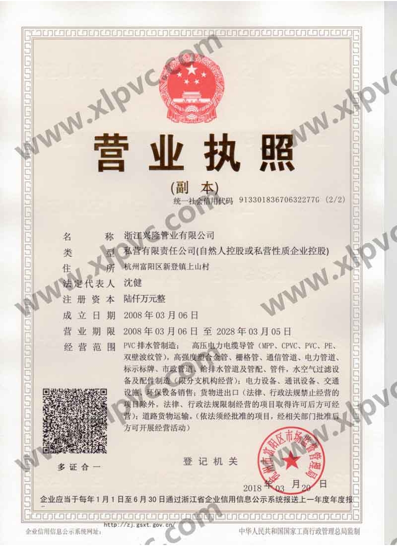 浙江興隆管業(yè)有限公司位于杭州市富陽區(qū)(杭州第九新區(qū)),坐落在新登鎮(zhèn),相距杭州僅60公里,水、陸、空交通運輸十分便利。浙江興隆管業(yè)有限公司前身為富陽興隆塑料制品廠,成立于1992年,2008年改名浙江興隆管業(yè)有限公司,數(shù)十年來,公司一直至力于管道的生產(chǎn),目前公司擁有國內(nèi)先進的CPVC保護管生產(chǎn)線,HPVC()雙壁波紋管生產(chǎn)線,多孔管生產(chǎn)線,玻璃鋼電纜保護管生產(chǎn)線、MPP電纜保護管生產(chǎn)線。生產(chǎn)的主要產(chǎn)品有:CPVC電纜保護管、MPP電力電纜保護管(頂管)、高強度塑合金管、HDPE給排水管、HPVC()雙壁波紋管、玻璃鋼電纜保護管、埋地通信用的PVC-U多孔管、PE直壁管、PVC-U雙壁波紋管、梅花管等,年生產(chǎn)能力達(dá)20000萬米。
